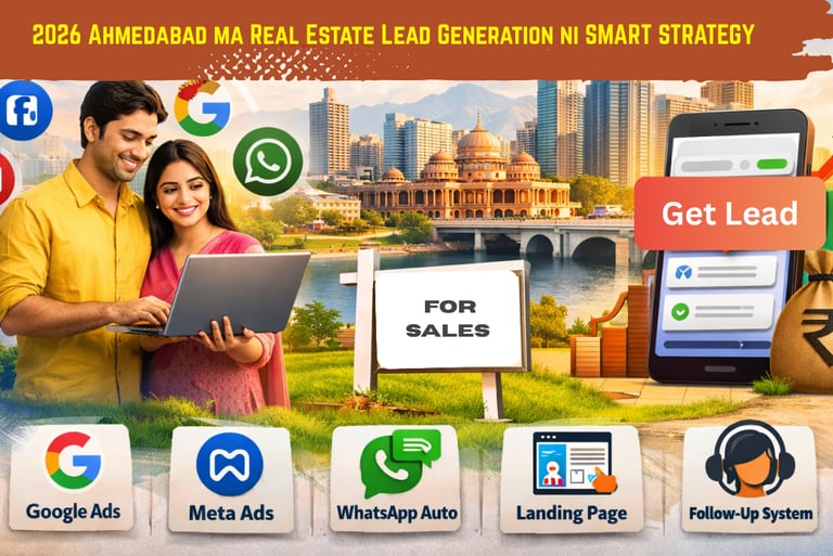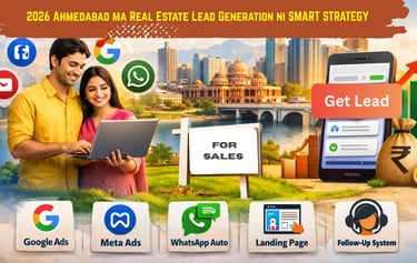 2026 Ahmedabad Real Estate Lead Generation Guide in Gujarati. Learn Google Ads, Meta Ads, Landing Pages, GMB, WhatsApp automation & local SEO strategies for high-quality property leads.
